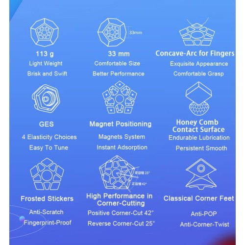 - Težina: oko 113 g — približno 15% lakši od većine megaminxova na tržištu.
