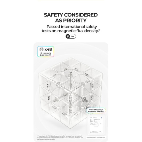 Magnetizacija: 48 ugrađenih magneta, raspoređenih u elementima, obezbeđuju stabilnu, ali ne preterano tvrdu fiksaciju slojeva i pomažu kocki da se sama poravna posle okretanja.